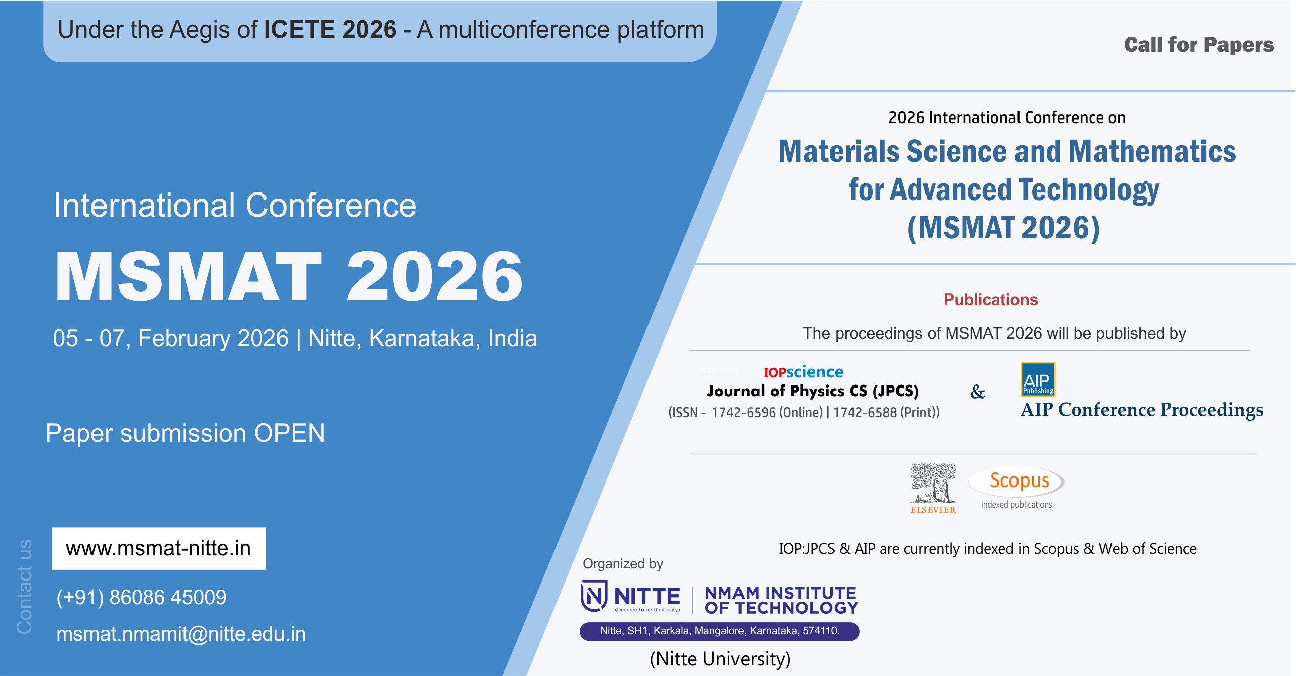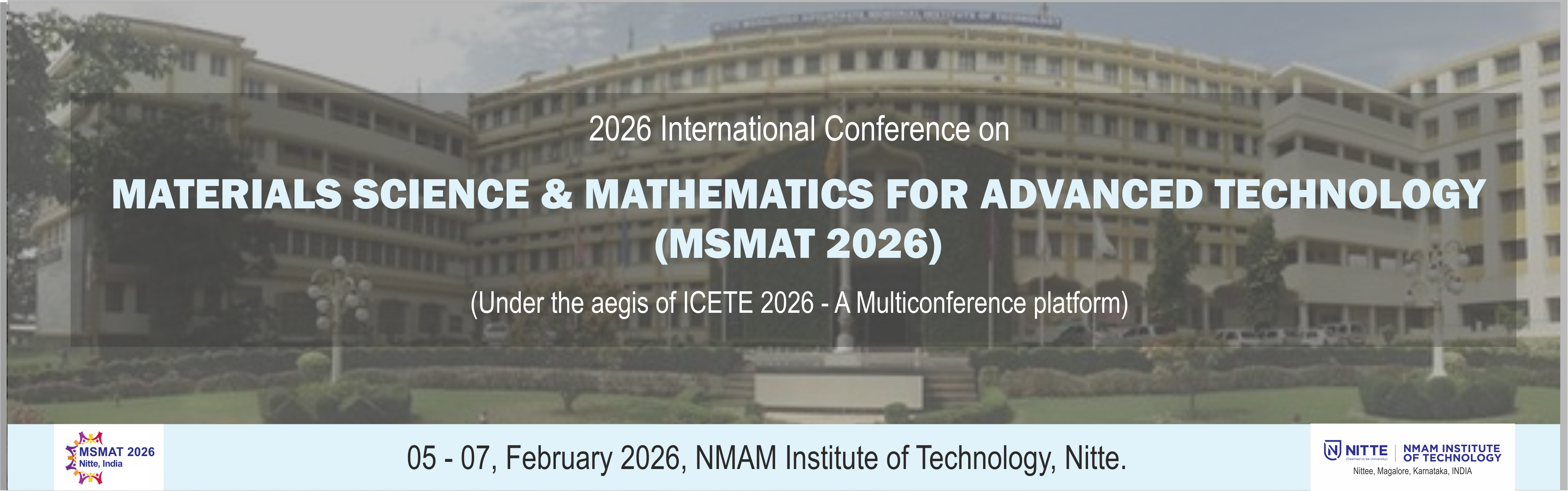 NMAM Institute of Technology, Nitte is hosting the multiconference ICETE-2026 during 5th to 7th February 2026. ICETE-2026 will have seven International Conferences under its umbrella which have been organized with specific themes pertaining to different departments. The Department of Physics, Chemistry and Mathematics are jointly organizing International Conference on Materials Science and Mathematics for Advanced Technology (MSMAT-2026) in offline mode. The main scope of MSMAT-2026 is to offer diverse sessions on the on-going developments and applications of materials science in designing modern technology. The conference, empowered by eminent speakers and researchers across the globe, will provide an opportunity for knowledge sharing and discussions on budding technological concepts with frontrunners in the respective fields. The deliberations include keynote addresses and invited talks by scientists around the world, oral presentations by researchers and academicians. The conference establishes multidisciplinary summit that integrate research and education in the vital field of materials science that transcends institutional, industrial, research organization and global barriers.